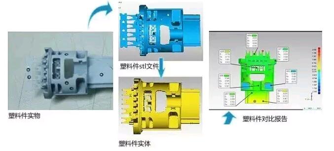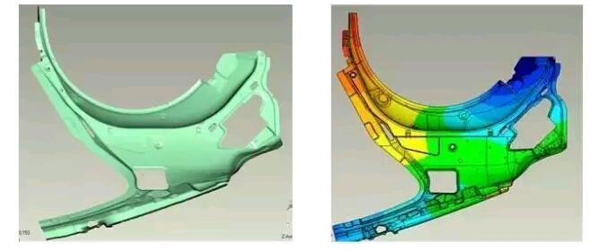 三維掃描系統(tǒng)能夠?qū)ζ囘M行裝配檢測,尤其是使用傳統(tǒng)手段難以檢測的自由曲面更加有效。在對整車或者部件進行掃描后,導(dǎo)入專業(yè)質(zhì)量檢測軟件進行尺寸檢測,生成的色差分析圖和誤差分析報告能夠更直觀了解誤差。這種自由曲面的三維檢測方式節(jié)省了人力和時間,讓制造商快速生產(chǎn)出精度高,質(zhì)量可靠的汽車配件,滿足了客戶的需求。